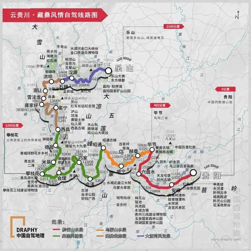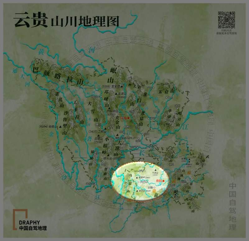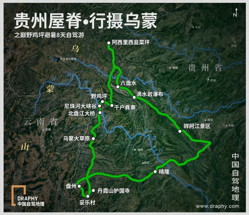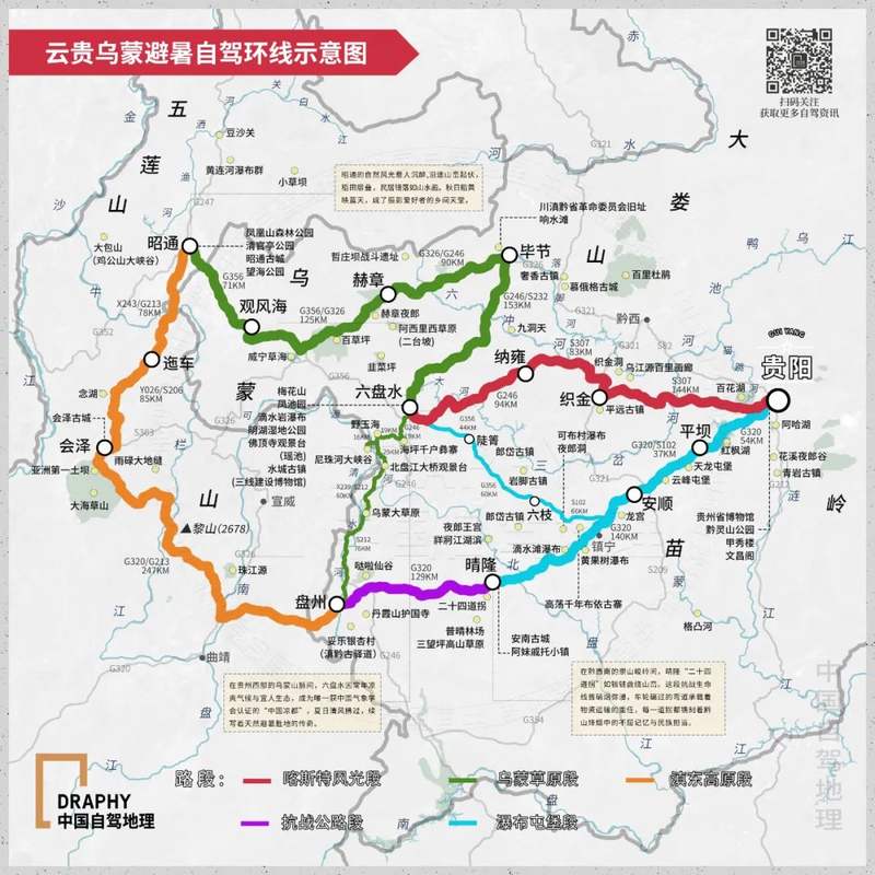 -这 是 自 驾 地 理 的 第 314 篇 原 创 路 书- 南方也有大草原!这里是云贵清凉秘境集合地! ” 如你喜欢这张图,文末有纯享版! 说到避暑,怎能不提六盘水!今天这条休闲自驾环线,就带你走进六盘水及周边这一带的避暑天花板——乌蒙山区! “贵州屋脊”乌蒙山地处云贵高原,横亘在云贵川三省交界处,跨云南曲靖、昭通、贵州六盘水、毕节,是众多大江大河的发源地,如珠江的上游南盘江、北盘江,长江流域的乌江、赤水河。 本线所在地理位置示意图 ▼