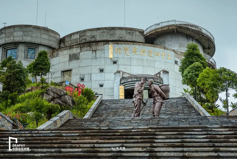 也正是有了这处滇黔线上的关键节点,才串联成一条抗战生命线,为前方运送约45万战略物资! “国际援华物资经滇缅公路、驼峰航线、中印公路(即史迪威公路)等运抵昆明后,必须经二十四道拐的滇黔线才能送到前线和重庆。”——原晴隆县文物管理所所长陈亚林。 在那烽火连天的艰难岁月里,是3200多名南侨机工们放弃优渥的生活,克服种种困难,驾驶着车辆,在这些运输线上昼夜不停,用生命输送抗战的血液! 山顶的二十四道拐展览馆 摄影@VIP读者·朱孟雄 ▼