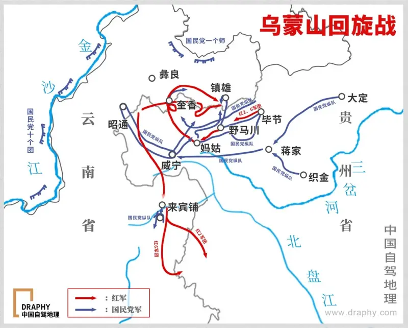 风光之外,毕节也有不少历史人文景观,如与奢香夫人相关的慕俄格古城(明代贵州宣慰府所在地)、奢香古镇(藏羌彝文化走廊的彝族小镇)。 “乌蒙磅礴走泥丸”,不能不提及在此发生的军事奇迹乌蒙山回旋战,赫章是主战场之一,留下了江南屯苏维埃政权、以则河战斗遗址、哲庄坝战斗遗址、野马川会议遗址等10多处红色革命遗址。 乌蒙山回旋战大致示意图 制图@《中国自驾地理》 ▼