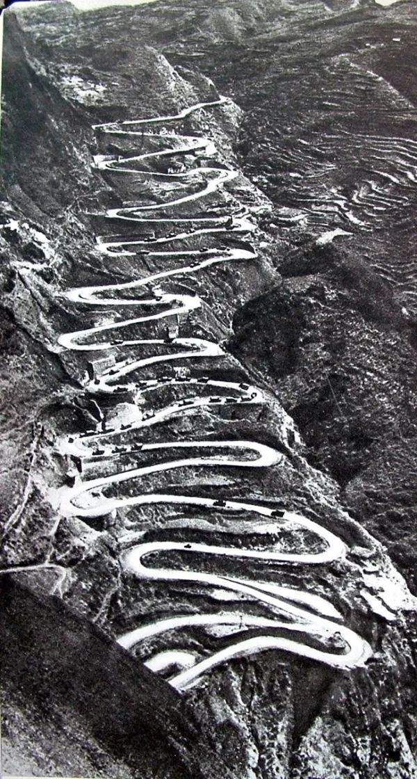 一座喀斯特岩层山体上,有24道连续不断的拐弯,全长4公里,直线距离约350米,垂直高度约250米,斜坡倾角约60度。 谁能想到这样一段山路,却是1935年抗战期间,由晴隆及周边县民工只花不到9个月的时间,用简陋工具“刨”出来的呢? 晴隆二十四道拐资料图 拍摄于1945年3月26日的晴隆二十四道拐 国际援华物资运输车队正蜿蜒通过 ▼
