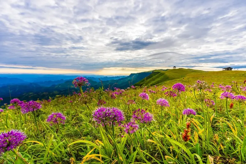 毕节更是“地球花园”:每年3~4月,百里杜鹃花开成海,面积达130多平方公里,堪称世界最大的天然花园。 而到了8~9月,兴发乡的大韭菜坪上,30万亩野生的紫蓝色韭菜花就会使整个韭菜坪成了花的海洋。 野生韭菜花海,图源@图虫创意 ▼