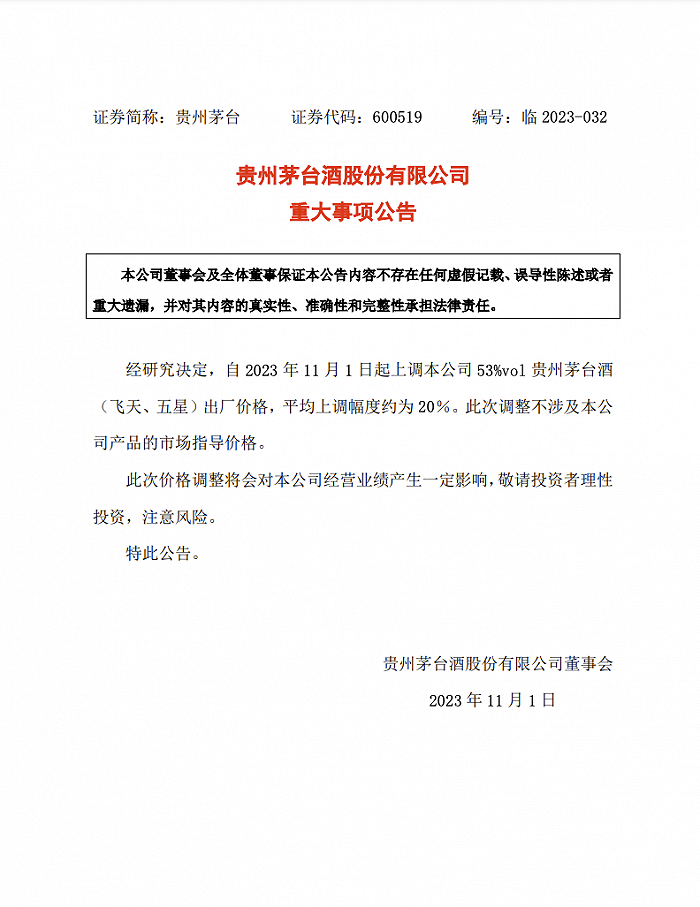 据上海市第一中级人民法院官微,2023年10月31日上午,上海市第一中级人民法院一审公开开庭审理被告人许垚故意杀人、投放危险物质案。上海市人民检察院第一分院派员出庭支持公诉,被告人许垚及辩护人、被害人的诉讼代理人、鉴定人、有专门知识的人到庭参加诉讼。庭审于当日22时15分结束。 庭审中,法庭围绕起诉指控的犯罪事实进行了调查,听取了控辩双方的辩论意见及被告人的最后陈述。法庭依法保障了被告人、辩护人、诉讼代理人的诉讼权利。被告人及被害人家属、政协委员、社会各界群众等50余人旁听了庭审。 大公司新闻 【恒大地产集团:截至9月末未能清偿的到期债务累计2808.3亿元】据界面,10月31日晚间,恒大地产集团有限公司发布公告称,截至2023年9月末,恒大地产集团涉及未能清偿的到期债务累计约2808.3亿元;此外,截至2023年9月末,恒大地产集团逾期商票累计约2060.84亿元;截至2023年9月末,标的金额3000万元以上未决诉讼案件数量共计1961件,标的金额总额累计约4534.17亿元。 【贵州茅台:11月1日起上调飞天、五星出厂价格,平均上调幅度约20%】据界面,贵州茅台10月31日晚间发布公告,经研究决定,自2023年11月1日起上调公司53%vol贵州茅台酒(飞天、五星)出厂价格,平均上调幅度约为20%。此次调整不涉及本公司产品的市场指导价格。此次价格调整将会对本公司经营业绩产生一定影响,敬请投资者理性投资,注意风险。