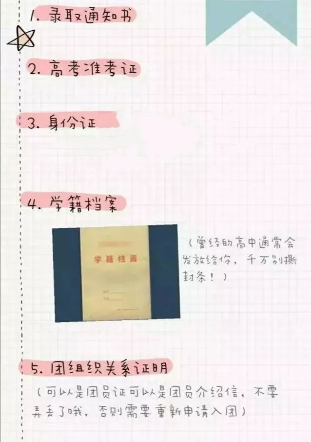 证件类(敲重点) 1、录取通知书 2、身份证 3、转团关系证明(来校报道之后,团员证,介绍信,团员档案等,学校会安排以班级为单位统一收取) 4、学籍档案袋(不可拆封) 5、免冠一寸照12张以上,两寸照4张以上(开学后会用到) 6、少量现金与银行卡(至少一张,以备不时) 7、需要办理助学贷款的同学,提前在生源地或者网上进行办理,办理后带好回执单 8、需要申请助学金的同学,请准备好相关证明