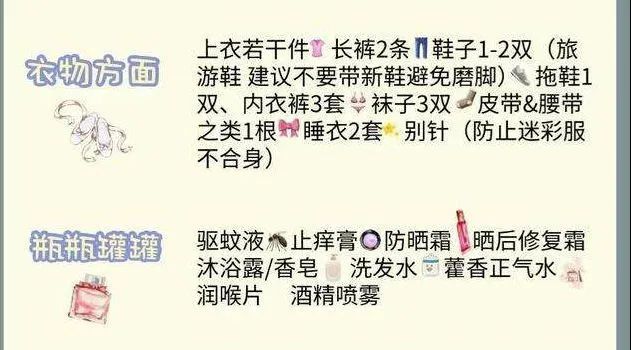 1、防晒霜、修复面膜 2、藿香正气水(防中暑) 3、鞋垫,纸巾和湿巾 4、大容量水杯