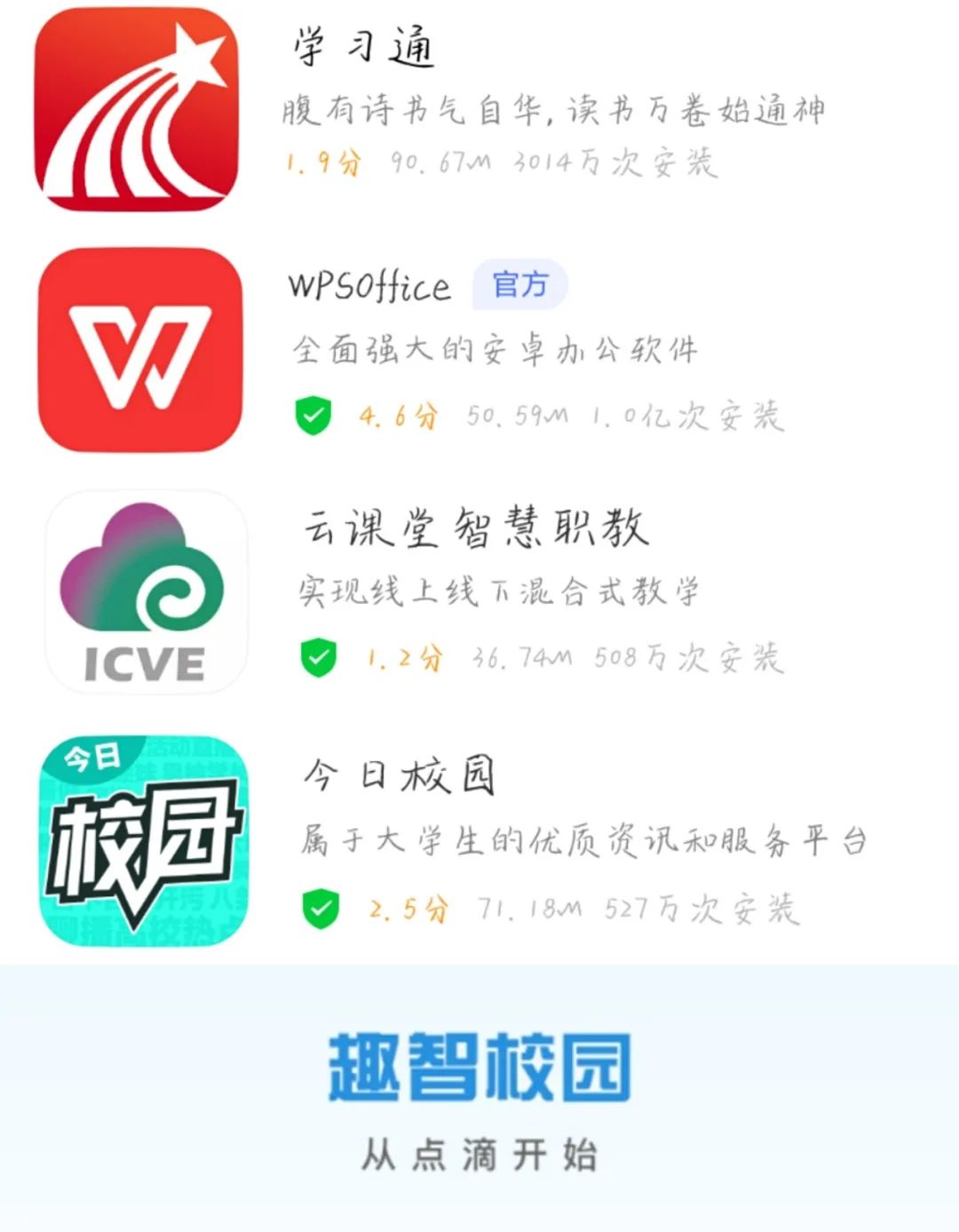 APP类 1、今日校园(日常打卡,签到,请假等,请同学们提前下载关注并关注我校哟) 2、学习通(网络选修课,查找资料等) 3、WPS Office(办公,学习,制作PPT等) 4、趣智校园(宿舍洗澡用水APP) 5、云课堂智慧职教(学习相关课程,课后复习等)