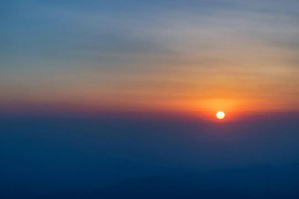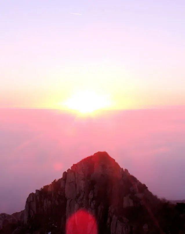 周围被一簇簇白云环绕着 远处的太阳慢慢地从地平线上升起 一道道金色的阳光喷薄而出 仿佛一道道金色的利剑直射 这就是泰山日出了