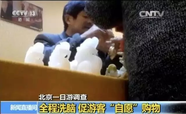 进入室内,游客即被集中安排到一个小房间内,有专员现场售卖竹炭纤维制品。之后导游带领游客到房间隔壁卖场,按单向路线选购商品。 下午三点多,另一名导游将游客送进故宫午门检票口后,意想不到的事情发生了。所有游客等待约20分钟后,始终未见导游跟上来,游客只能自行进入故宫。 全程洗脑 诱导游客“自愿”购物 承诺“无购物”的“北京一日游”,实则暗藏玄机。记者调查发现,上车后导游除了明显地要求游客购物外,还会不停地讲授、套用所谓的风水说法。到达皇家四合院后,就有新导游接手散客团,讲解中话里话外也在不断释放风水、平安等字眼。