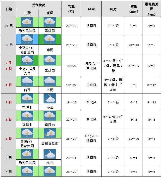 影响预报及关注建议 降水影响:未来十天多降水,降水时段道路湿滑,能见度较低,关注雨雾天气对五一假期交通出行的不利影响。 强对流影响:关注强对流天气对滨海旅游、户外活动等的不利影响。 大风影响:5月1~4日白天沿海风力较大,关注大风对海上航运、滨海活动等的影响。