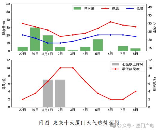 许多小伙伴关心 厦门“五一”假期 天气如何呢? 厦门未来十天多降水 “五一”出行注意防范! 据气象部门预测 未来十天厦门多降水 其中“五一”假期期间 1日、5日雨势较强! 未来10天翔安天气预报 降水:未来十天多降水,其中30日~5月1日、5日雨势较强;2~4日、6~8日降水减弱,以分散性雷阵雨为主。降水时局地伴有雷电、短时强降水、短时大风等强对流天气,能见度较低。 气温:29~30日气温较高,受冷空气影响,5月1~4日气温有所下降,5日起气温将再次回升。 风力:受冷空气影响,5月1日~4日白天我区沿海有 6~8级东北大风。 逐日预报(时效为当日08时~次日08时)