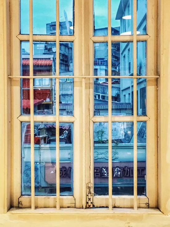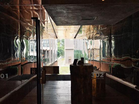 进门之后十多米挑高直观地刺激感官,斑驳墙面和裸露钢筋里穿插花砖地面,铁窗外露出绿植的生命力,和谐呈现出一幅带有酷感的美好画面。