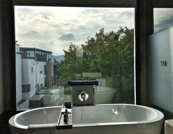 相比传统严密规整式的酒店,对着山间的浴缸则让我体会到身心与自然融为一体,窗户也的确如宣传理念所说的像独一无二的明信片。