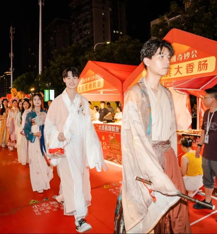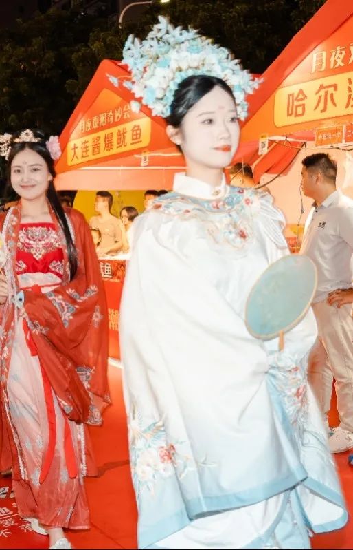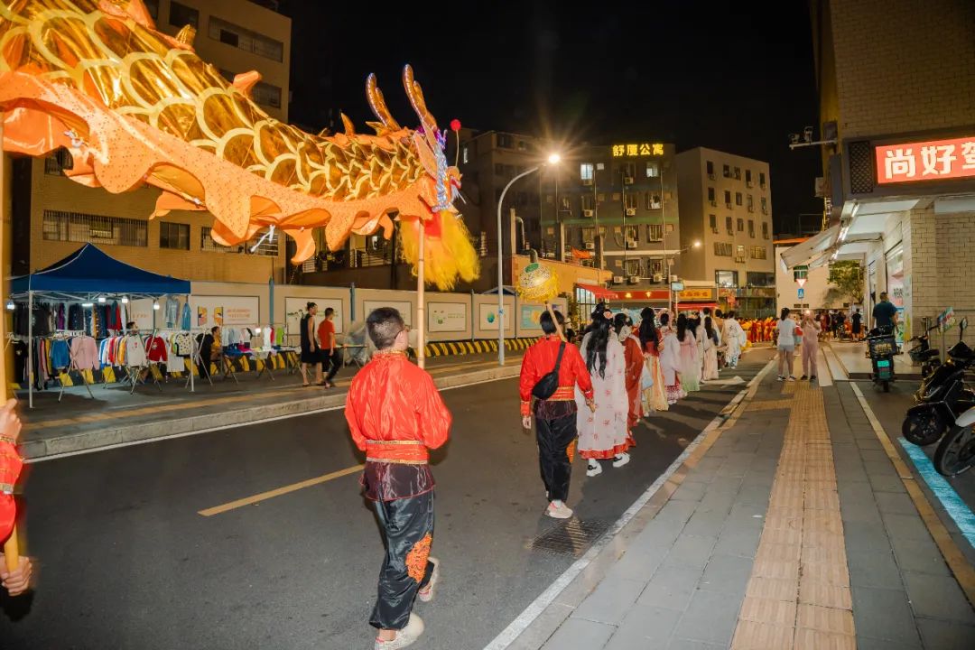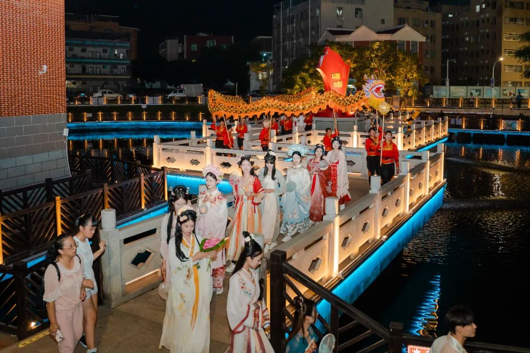 当晚的活动内容 包含汉服巡游、国潮表演和博饼大会等 精彩连连 小海跟随巡游队伍 一同夜游渐美 鱼灯、舞龙、汉服、腰鼓…… “一夜鱼龙舞” 一路欢歌、一路笑语 现在跟着镜头拍摄的高清大图 我们一起回顾昨晚的火爆场面