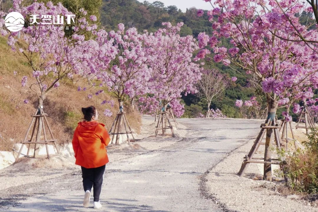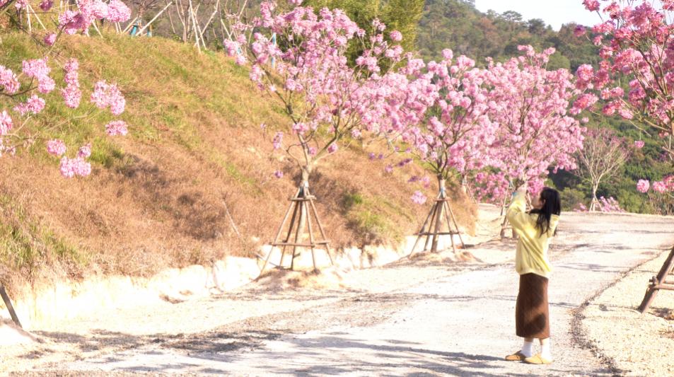 2024年1月探花郎花海资料图 探花郎花海观光园 位于洪塘村赤土社的九行山上 目前已栽种10000多株樱花、风铃木 其中紫花风铃木将于元旦前后绽放 远眺,近观 一片粉色海洋,蔚为壮观 微风吹来 花瓣纷纷扬扬飘落 空气中将弥漫着浪漫气息