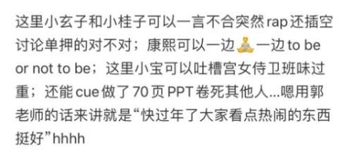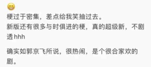 “2025年不看《鹿鼎记》快乐少一半 ” “简直是去班味神器!” “一言不合就跳舞,笑发财了!” “太抽象了,甚至能看见话剧演员唱rap ” “想到它好笑,没想到它这么癫!” 不少观众看完后 第一时间在社交平台留下自己的观演感受 “好笑”一词的使用度最高 根据2025年1月19日首演数据 全长约140分钟的话剧 总共有331次笑声,平均25秒笑一次!