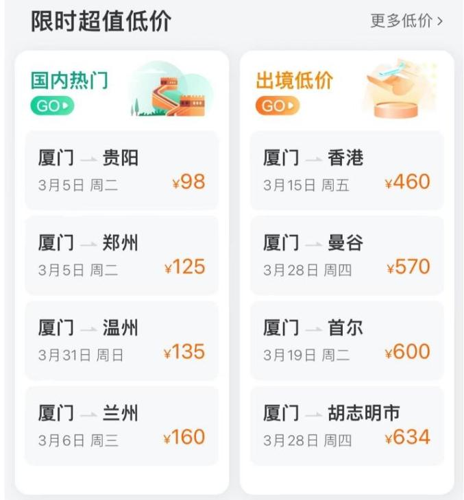 厦门—郑州 3月去程最低价:125元