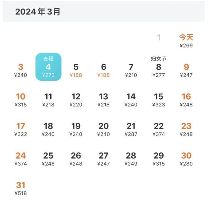 厦门—上海 3月去程最低价:260元