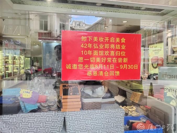 老顾客赶场打卡 “再不来就没了!” 9月8日 在大中路弘业美妆店的清仓货架前 顾客郭女士攥着两瓶护肤品 正精心挑选着 厦门日报记者在现场看到,店内许多货架已清空,门口贴着红色告示写着,“42年弘业即将结业”。除了正在清点商品的工作人员,不时有老顾客停下脚步,在熟悉的货架前挑选心仪之物。