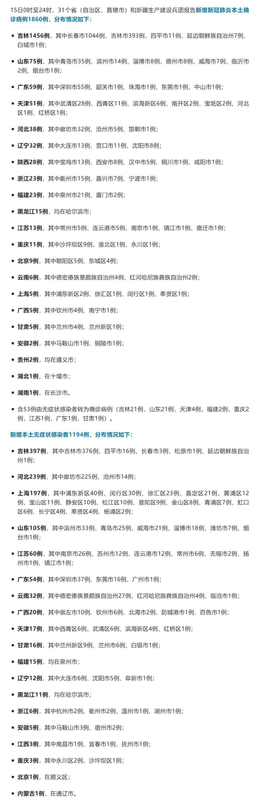 民航局对五个入境航班发出熔断指令 3月15日,民航局再发熔断指令,对韩亚航空公司OZ323航班(首尔至成都)等5个航班实施熔断措施。 根据民航局通报,3月3日入境的韩亚航空公司OZ323航班(首尔至成都)确诊新冠肺炎旅客6例,鉴于OZ323航班(首尔至成都)为OZ303航班(首尔至长春)的奖励航班(OZ323/4航班已自3月14日起因航班熔断而取消),自4月25日起,继续暂停OZ303航班运行2班。3月3日入境的韩国首尔航空公司RS831航班(首尔至烟台)确诊新冠肺炎旅客8例,自4月4日起,继续暂停该航班运行2班。3月6日入境的老挝国家航空公司QV815(万象至昆明)确诊新冠肺炎旅客5例,自3月21日起,继续暂停该航班运行2班。3月7日入境的春秋航空公司9C8570航班(首尔至上海)确诊新冠肺炎旅客6例,自4月4日起,继续暂停该航班运行2班。3月12日入境的南方航空公司CZ3056航班(仰光至广州)确诊新冠肺炎旅客12例,自3月28日起,暂停该航班运行4班。上述熔断的航班量不得用于其它航线。 民航局要求,上述5家航空公司要做好后续航班旅客安抚和机票退改等服务工作。 本土新增1860+1194 15日0时至24时,31个省(自治区、直辖市)和新疆生产建设兵团报告新增新冠肺炎本土确诊病例1860例,新增本土无症状感染者1194例。