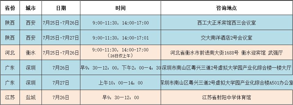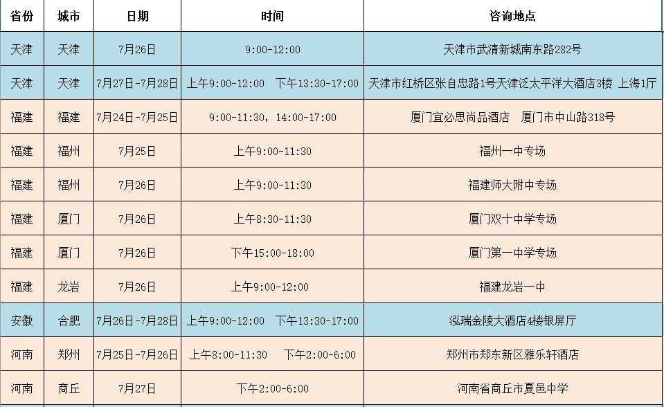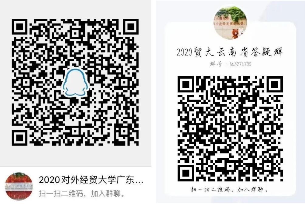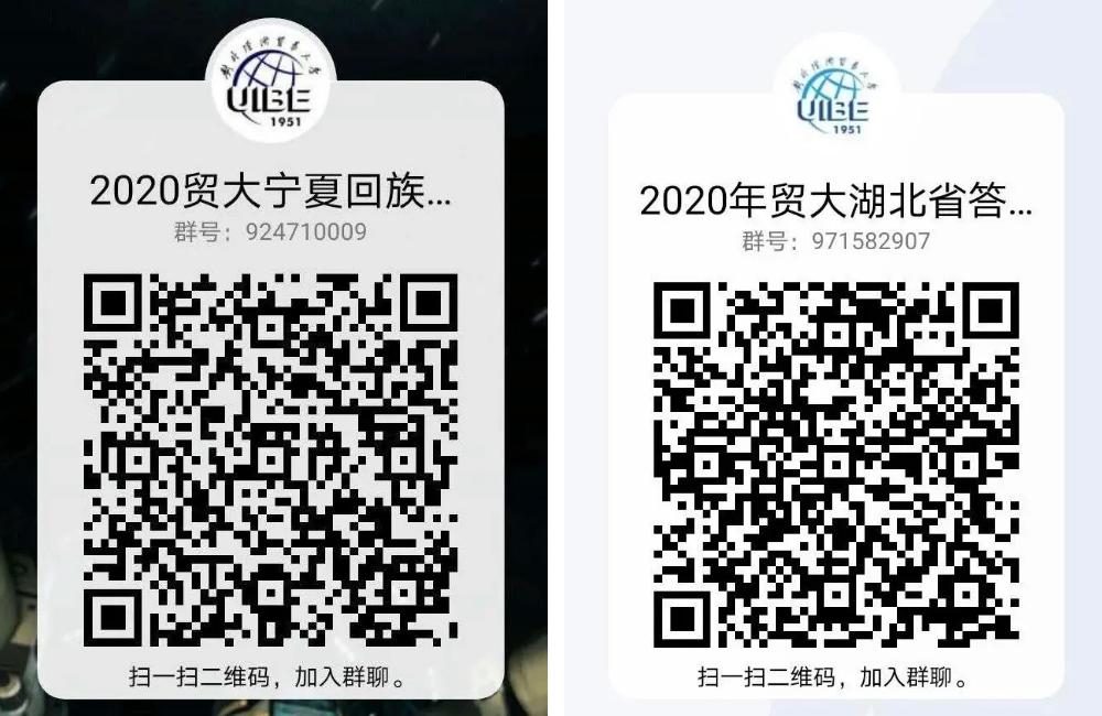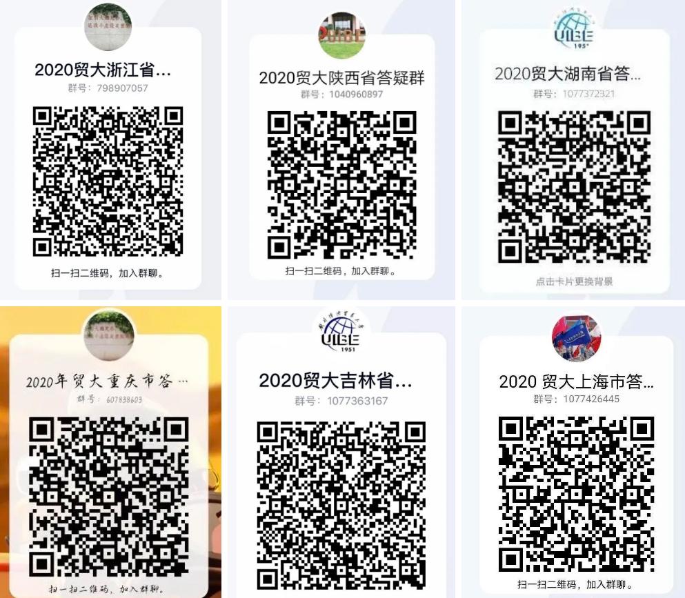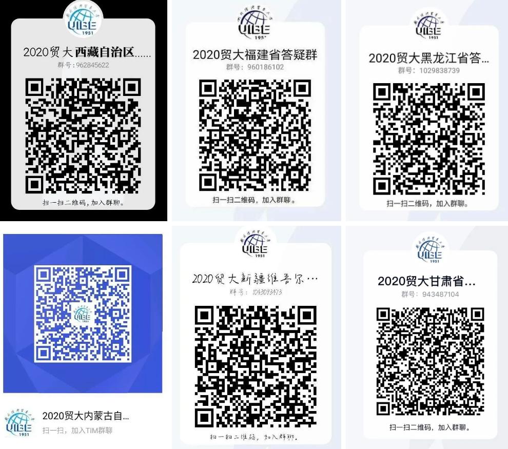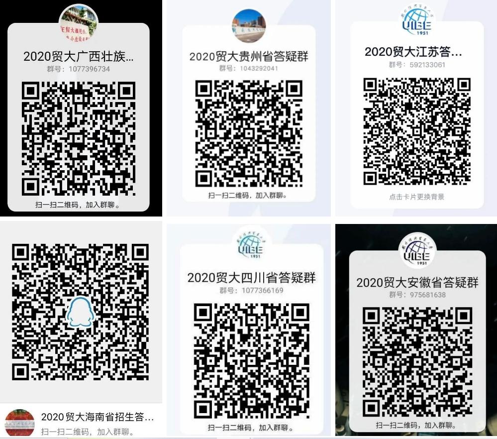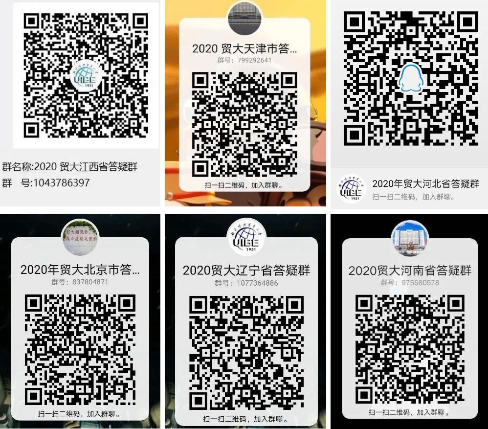 安徽合肥 2020年安徽合肥招生组的活动安排: 一、线下咨询安排 时间: 7月26日-7月28日 9:00-12:00,13:30-17:00 地点:泓瑞金陵大酒店4楼银屏厅 地址:合肥市蜀山区祁门路1799号 烦请参加线下咨询的各位考生与家长提前扫描上方二维码进行预约登记。按照防疫要求佩戴口罩、做好防护。 二、线上咨询安排 合肥市QQ答疑群号:975681638 合肥市咨询热线:010-89632913 招生办咨询热线:010-64492178 招生就业处网站:https://aeo.uibe.edu.cn/ 江苏盐城 2020年江苏盐城招生组的活动安排: 一、线下咨询安排 时间:7月26日上午 地点:江苏省射阳中学体育馆 二、线上咨询安排 江苏省QQ答疑群号:592133061 江苏省咨询热线:01089632910 招生办咨询热线:010-64492178 招生就业处网站:https://aeo.uibe.edu.cn/ 天津 2020年天津招生组的活动安排: 一、线下咨询安排 1.时间:7月26日 上午 地点:杨村一中 2.时间:7月27日-7月28日 上午9:00-12:00 下午13:30-17:00 地点:天津泛太平洋大酒店3楼 上海1厅 地址:天津市红桥区张自忠路1号 烦请参加线下咨询的各位考生与家长提前扫描上方二维码进行预约登记。按照防疫要求佩戴口罩、做好防护。 二、线上咨询安排 天津市QQ答疑群号:799292641 天津市咨询热线:010-89632902 招生办咨询热线:010-64492178 招生就业处网站:https://aeo.uibe.edu.cn/ 福建 今年对外经济贸易大学在福建的招生咨询将以宾馆驻扎+中学专场的方式进行,以下是本次招生组的活动安排: 一、 福州 7.25号上午9:00-11:30 福州一中专场 7.26号上午9:00-11:30 福建师大附中专场 二、厦门 7.26号上午8:30-11:30 厦门双十中学专场 7.26号下午15:00-18:00 厦门第一中学专场 三、福建其他地区(含福州、厦门) 7.24,7.25号9:00-11:30,14:00-17:00可到宾馆咨询 地址:厦门宜必思尚品酒店 地点:厦门市中山路318号 四、联系方式 联系人:叶老师 微信号:603404656(加入时需注明考生分数) 福建省QQ答疑群号:960186102 福建省咨询热线:010-89632914 招生办咨询热线:010-64492178 招生就业处网站:https://aeo.uibe.edu.cn/ 河南郑州 2020年河南郑州招生组的联系方式: 一、咨询时间: 2020年7月25日-7月26日 上午8:00-11:30 下午2:00-6:00 二、地点:郑州市郑东新区雅乐轩酒店 三、地址:郑州市郑东新区金水东路49号 四、交通方式: (1)地铁1号线(途径郑州东站及郑州站)东风南路站下车,D口出,沿祥盛街向东,快到心怡路向北即到,步行10-12分钟。 (2)地铁5号线金水东路站B口出,向南步行100米左右即到。 酒店电话:0371-86627888 五、联系方式 联系人:史老师 联系电话:15652792231 // 线上咨询方式
